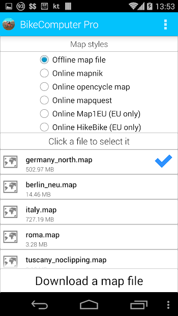 ✓ Plan your route! Touch the map where you want to go. BikeComputer Pro will calculate a route with distance, elevation and elevation profile for you and will save the route to follow it while riding